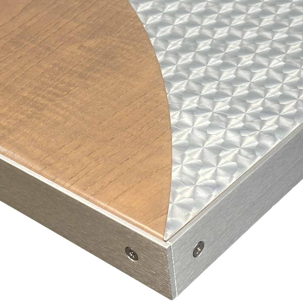 Ash Veneer and Silver Foil Tabletop in Custom Pattern with 1-1/2″ Brushed Aluminum Edges